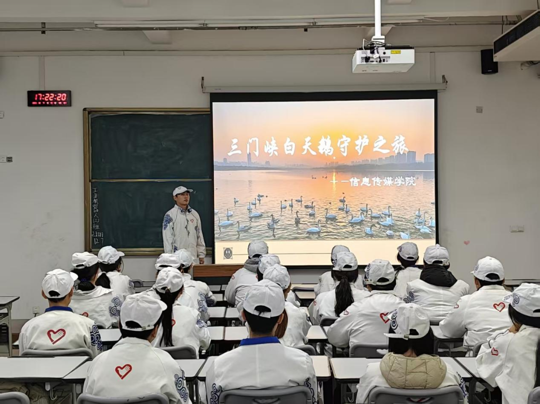活动开场,以三门峡黄河湿地越冬白天鹅的实拍视频引入,画面中数百只洁白天鹅在波光粼粼的水面游弋、振翅的场景,瞬间唤起了师生对这群“远方来客”的关注与喜爱。随后,从“初识白天鹅”“守护进行时”“我们在行动”三个维度展开宣讲:初识白天鹅”环节介绍其形态特征、西伯利亚迁徙习性,阐释其“生态指示物种”价值;“守护进行时”点明其国家二级保护动物身份,结合数据展示三门峡种群增长趋势,同时以非法猎捕获刑案例,剖析栖息地破坏、污染等威胁的危害与法律后果;“我们在行动”则引导信息学子积极参与保护实践。