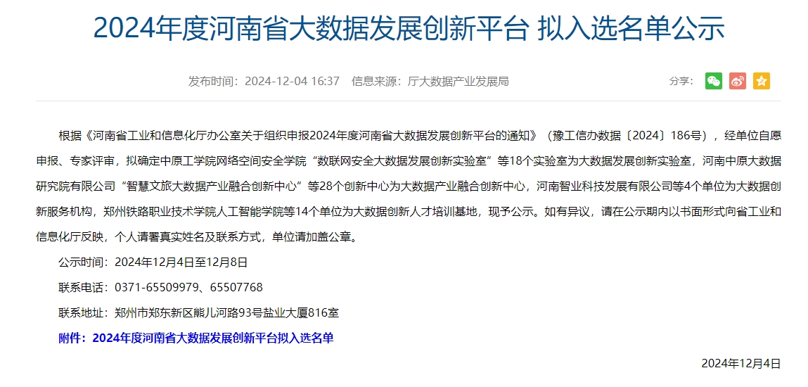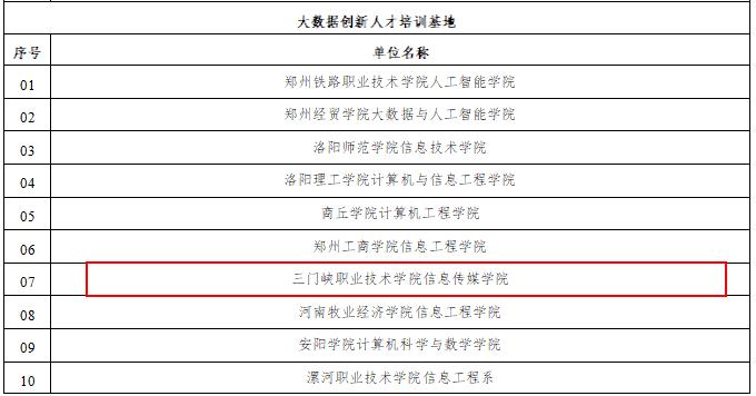根据《河南省工业和信息化厅办公室关于组织申报2024年度河南省大数据发展创新平台的通知》(豫工信办数据〔2024〕186号),经单位自愿申报、专家评审,12月4日,河南省工业和信息化厅公示了2024年度河南省大数据发展创新平台入选名单。三门峡职业技术学院77779193永利集团建设的“大数据创新人才培训基地”成功入选河南省大数据发展创新平台。