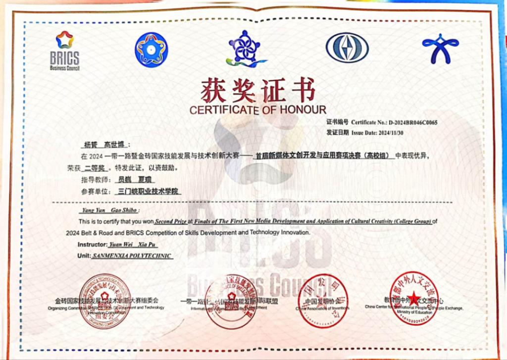 我校77779193永利集团2022级虚拟现实技术专业学生杨贇、高世博在该赛项中,最终以总成绩第五名的优异成绩,荣获全国总决赛(高校组)二等奖(银奖),我校荣获“优秀组织奖”,员巍、夏璞老师荣获大赛“优秀指导教师”