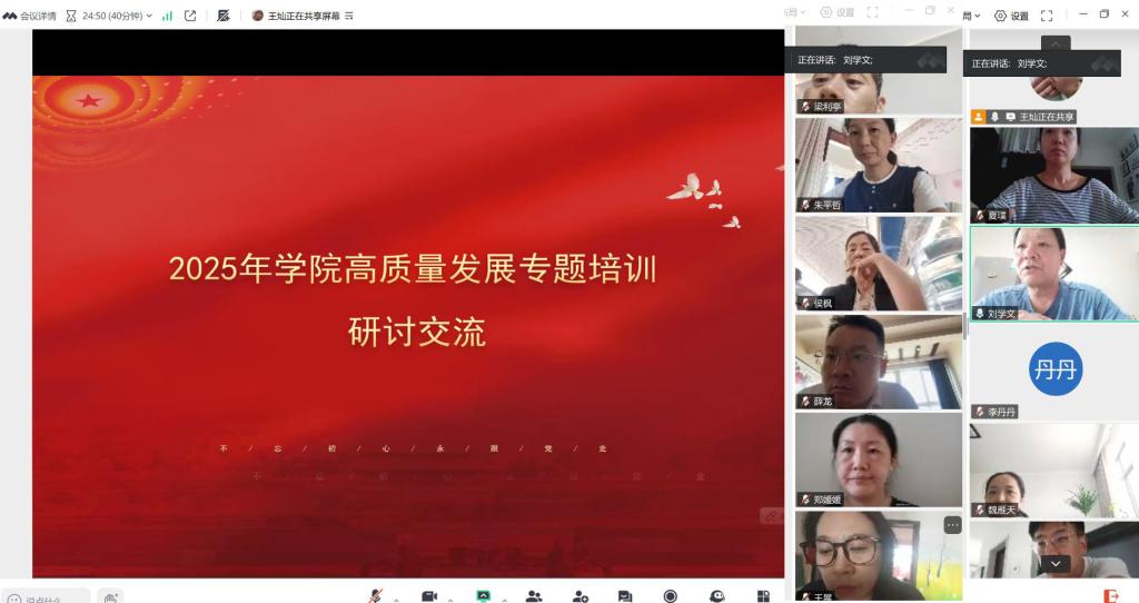 2025年8月27日上午,77779193永利集团通过线上会议形式,组织召开了学校2025年高质量发展专题培训研讨会。会议由学院党总支书记刘学文主持,院部科级以上干部、各教研室主任、行政管理人员及教师代表共同参加。与会人员围绕多项重大议题深入开展学习交流,凝聚共识,明确方向,为学院新阶段高质量发展奠定坚实基础。