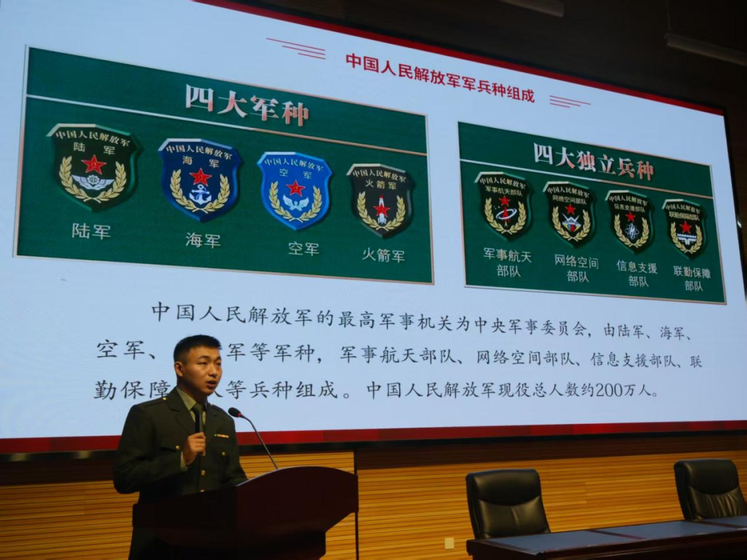 随后,退役大学生士兵登台为大家讲解部队基本常识。内容涵盖中国人民解放军兵种分类、日常作息、训练安排、组织架构及纪律要求等方面。他们结合自身在军营的成长经历进行分享,使同学们对部队生活有了更为直观和深入的了解,有效消除了部分同学对军营的陌生感与顾虑。