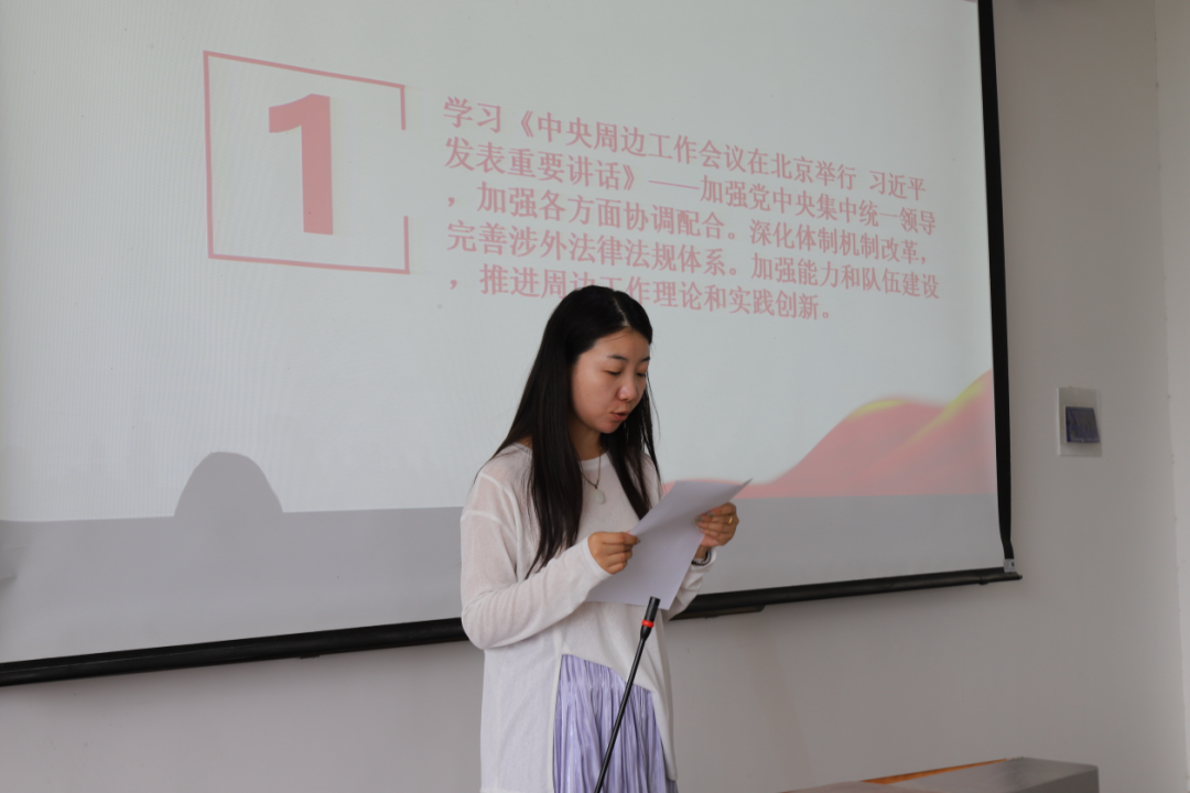 首先,支部党员夏璞和李丹丹带领大家集中学习了习近平总书记在中央周边工作会议上的重要讲话和《习近平关于加强党的作风建设论述摘编》中有关党性问题的精辟论述。与会党员们发表学习感悟,大家纷纷表示,要在今后学习和工作中,坚定不移地以习近平新时代中国特色社会主义思想为指导,紧紧围绕党和国家中心任务,积极践行初心使命,以实际行动为教育事业的发展添砖加瓦,贡献自己的智慧与力量。
