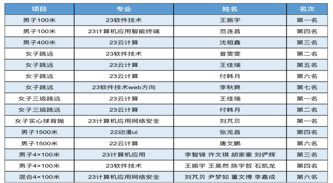 在备战本届运动会期间,院部领导高度重视,统筹安排,多次召开协调推进会,对前期准备工作做出详细安排,通过举办院部春季运动会,选拔出一支奋勇当先、敢于拼搏的参赛队伍,在备赛期间训练中充分展现出了信息学子们顽强拼搏、不惧困难、锐意进取的精神风貌。院部团总支、学生会、自管会三支学生干部队伍通力合作,为运动员的顺利比赛提供了全方位的保障服务。