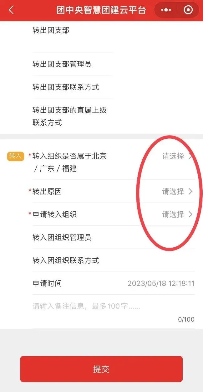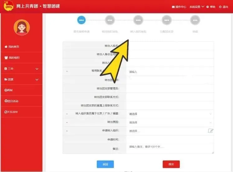 选择转出团支部、转出人姓名、转入组织是否属于北京/广东/福建、转出原因和转入组织等。提交申请,在转入组织的管理员审批同意后,转接完成。