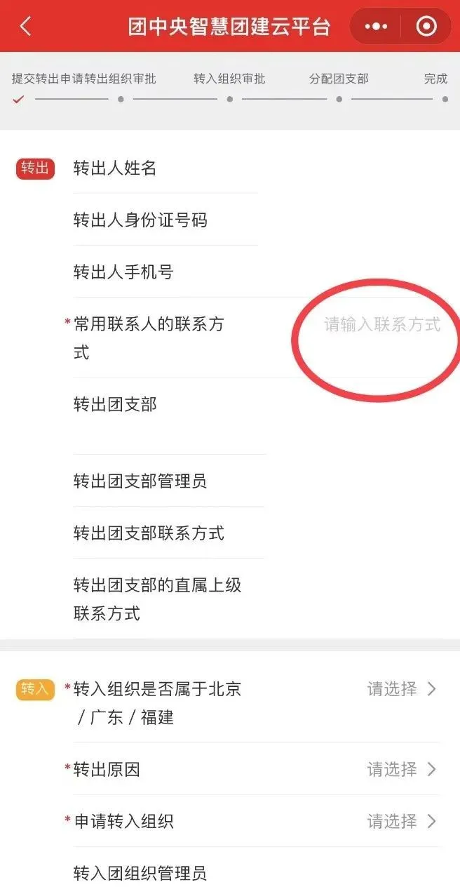 进入此界面后,务必填好全部信息,部分个人信息系统已生成,必填常用联系人联系方式、转入组织是否为北京/广东/福建、转出原因和申请转入组织。