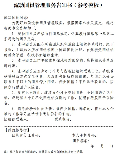 注意:①流动团员应编入“流动团员团支部”并建立网络社群,加强联系管理。②可根据需要要求流动团员填写《流动团员管理服务告知书》并签字确认、防止失联。