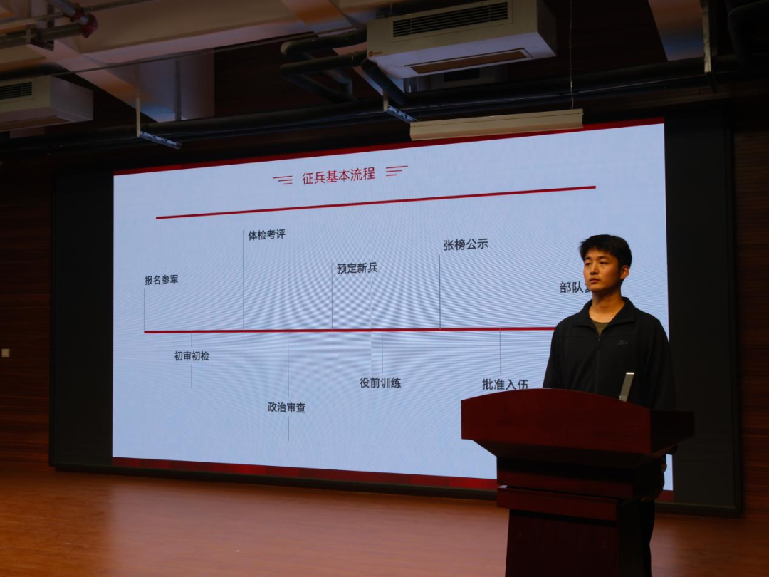 会上,田建鑫结合最新《征兵工作条例》,系统解读了2025年征兵对象、年龄要求、身体条件及报名流程,并重点介绍了大学生入伍的优惠政策,包括学费补偿、升学加分和就业扶持等。他通过视频和真实案例,阐述了参军对个人成长的锤炼价值,强调青年学子投身国防对实现“强国梦、强军梦”的重要意义。