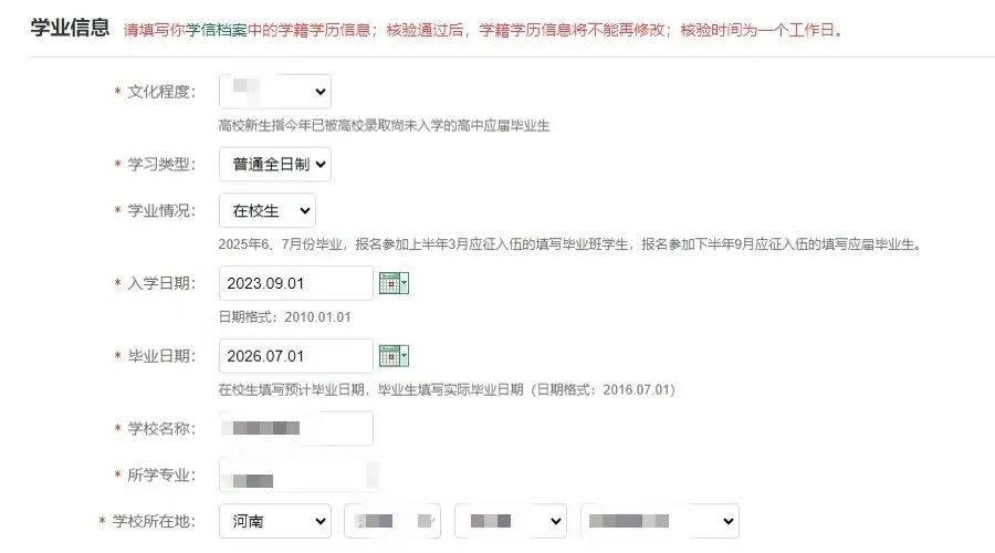 填写学信网学生档案中的学籍学历信息,如果对学籍信息有疑问,请登录学信网查看与学信网信息一致方能通过。