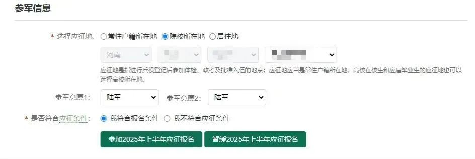 根据自己实际情况,选择应征地、参军意愿以及是否符合应征条件。