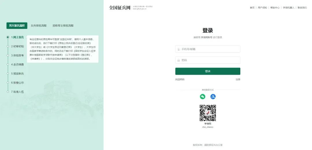 男青年应征报名之前需进行兵役登记,点击兵役登记(男兵)按钮弹出界面如下,如果没有登录过全国征兵网,系统会要求用学信网账号登录,如下图:
