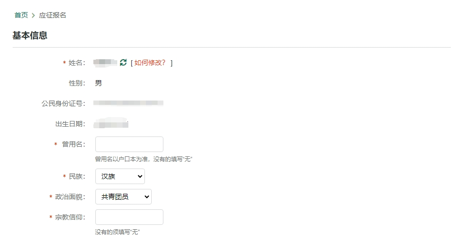 姓名、身份证号码等系统自动填写,剩下的民族、宗教信仰、政治面貌、家庭住址、联系方式等等信息,如实填写即可。