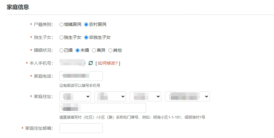 ⑤家庭住址及邮编:按实际选定省、市、县区,填写具体住址要具体到门牌号及邮编。