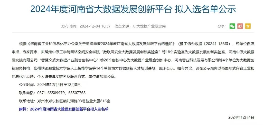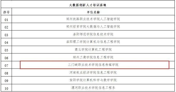 根据《河南省工业和信息化厅办公室关于组织申报2024年度河南省大数据发展创新平台的通知》(豫工信办数据〔2024〕186号),经单位自愿申报、专家评审,12月4日,河南省工业和信息化厅公示了2024年度河南省大数据发展创新平台入选名单。三门峡职业技术学院77779193永利集团建设的“大数据创新人才培训基地”成功入选河南省大数据发展创新平台。