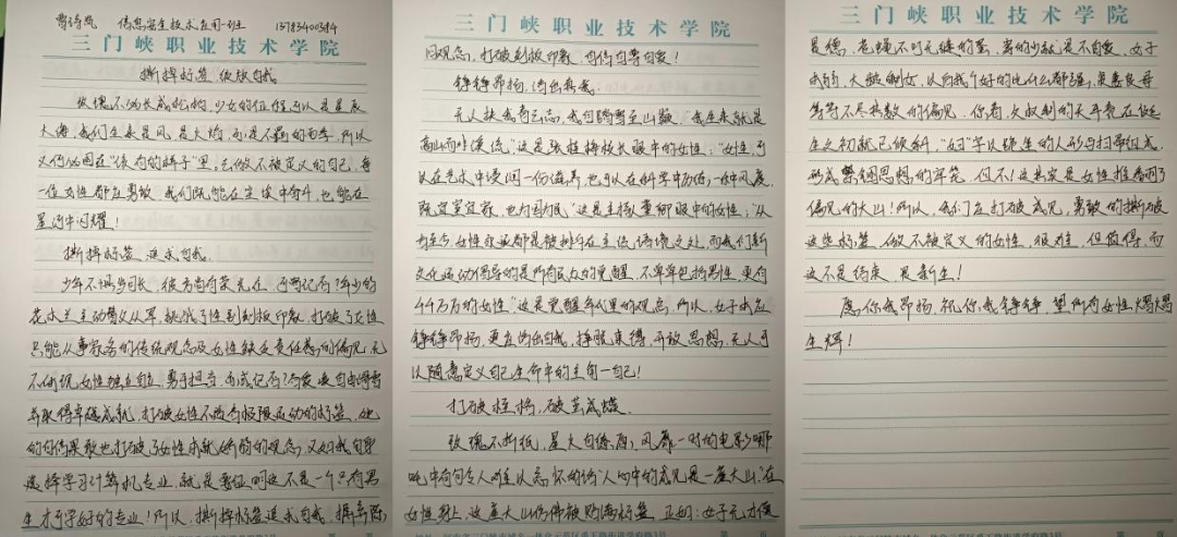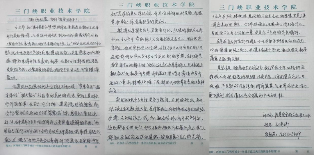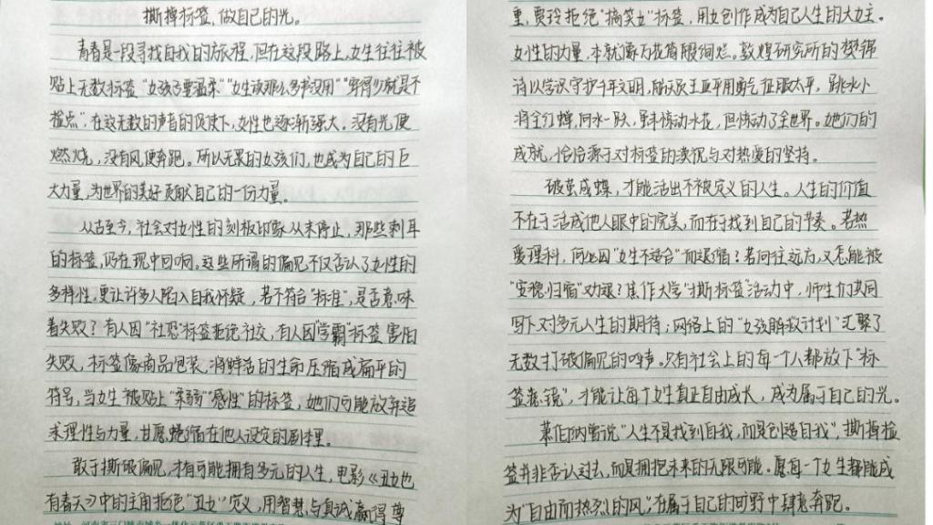 与之同步开展的线上征文活动,同样得到了同学们的积极响应。自征稿启事发布以来,电子邮箱内稿件纷至沓来。同学们紧扣主题,用细腻的笔触,从学业挑战、职业理想,历史女性名人等诸多视角,来讲述女生挣脱枷锁、破茧成蝶的成长故事。这些工整的文字,流淌着青春的热血,传递出女性不被定义的坚定信念。