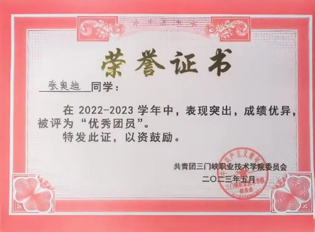 2.在2022—2023学年中,表现突出,成绩优异,荣获共青团三门峡职业技术学院委员会授予“优秀团员”荣誉称号;