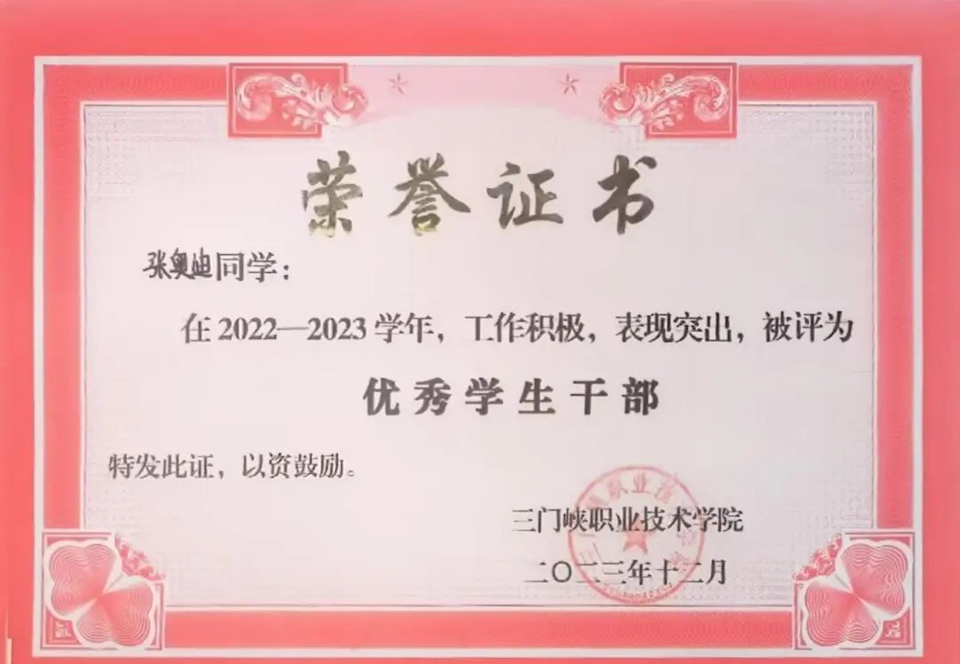 5.个人在2022—2023学年,工作积极,表现突出,被评为三门峡职业技术学院“优秀学生干部”;