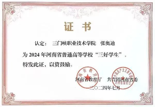6.被河南省教育厅认定为2024年河南省普通高等学校“三好学生”。