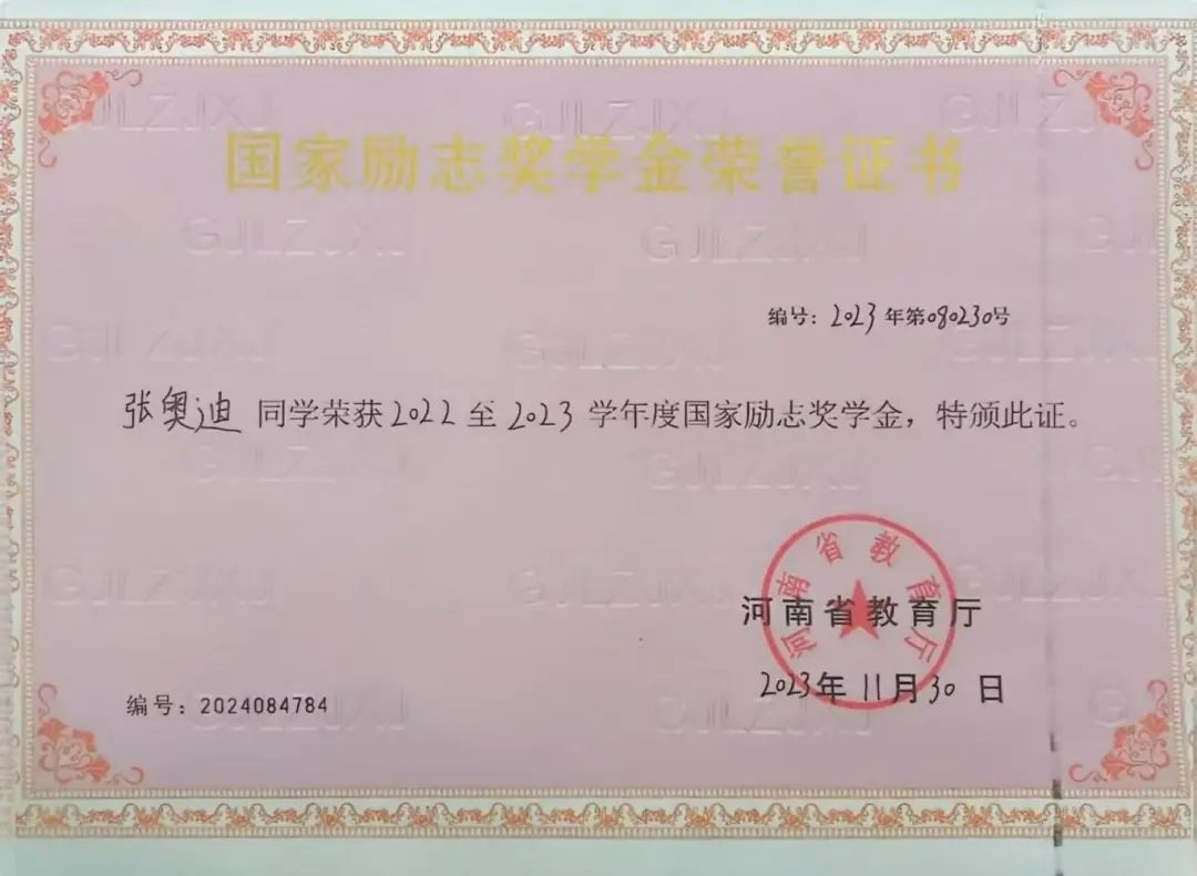 1.荣获2022—2023学年度 “国家励志奖学金”;