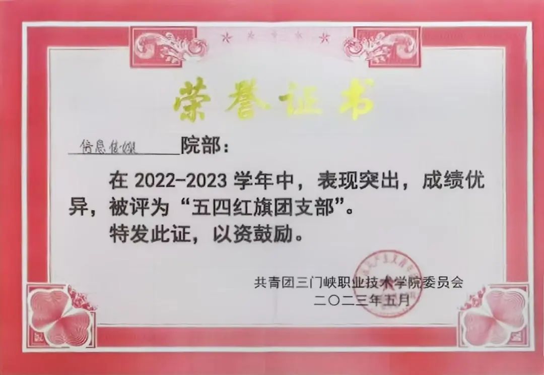 3.所带班级在2022—2023学年中,表现优异,成绩突出,被共青团三门峡职业技术委员会授予“五四红旗团支部”荣誉称号;