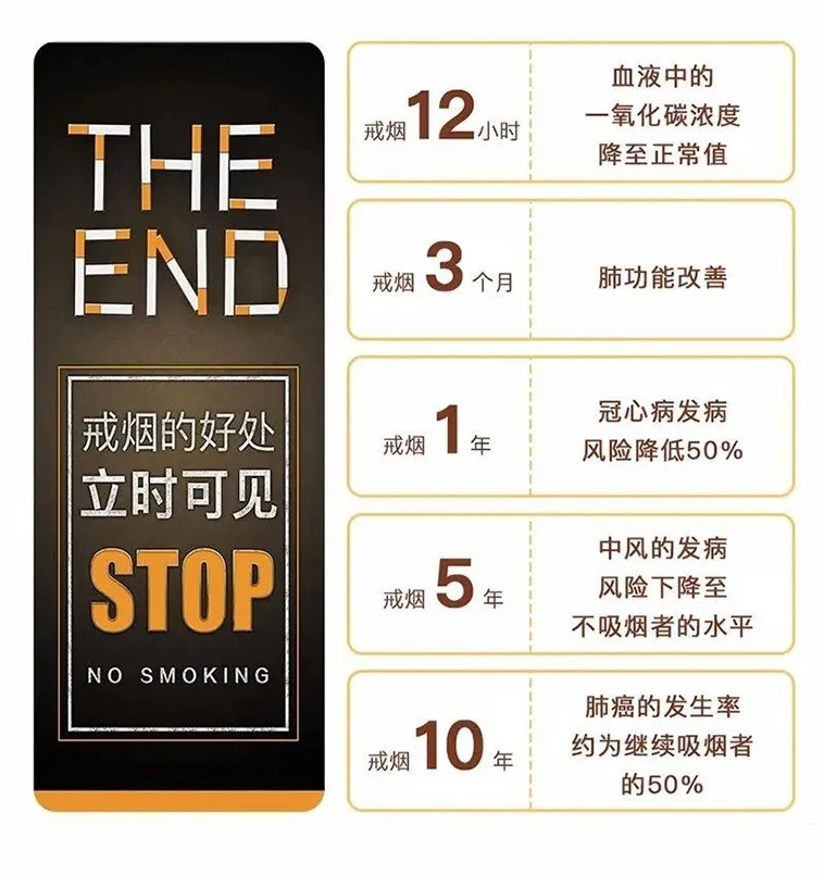 (4)吸烟者死于冠心病的危险度是从不吸烟者的2倍。而吸烟者戒烟后一年之内,这种危险就会降低50%。坚持戒烟15年之后,这种危险度就会接近于从不吸烟者的水平。