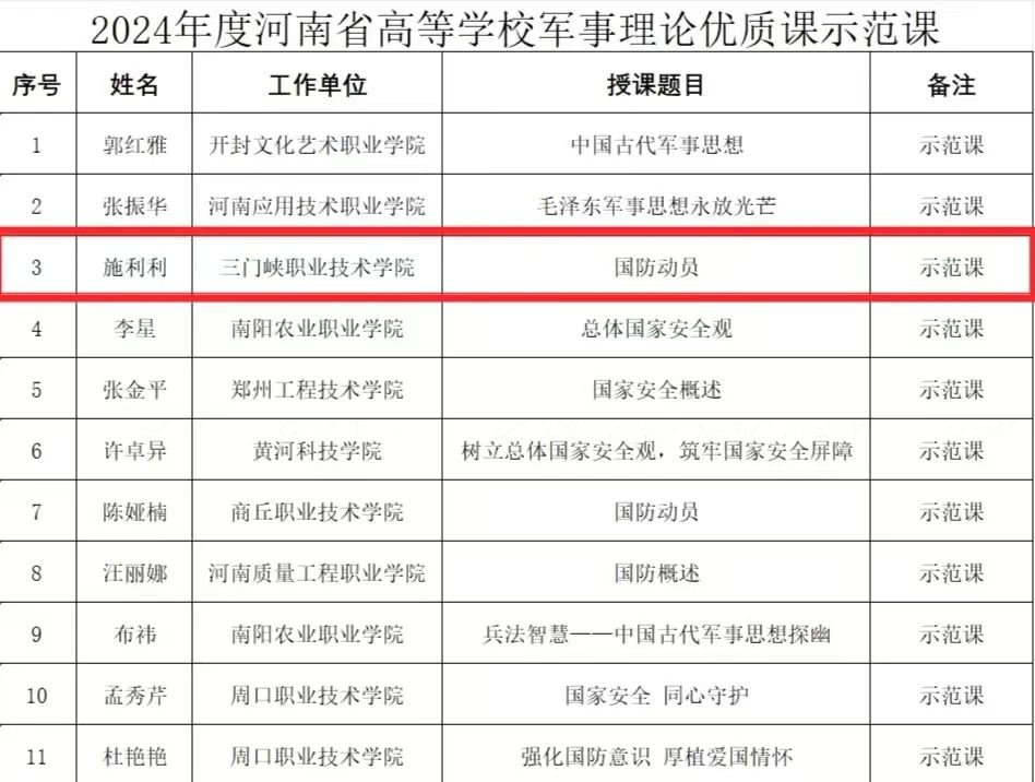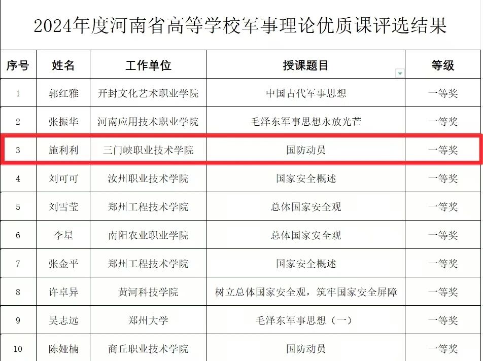 高等学校军事理论优质课程征集活动由河南省教育厅主办,旨在完善高校军事课教师知识结构,展示教学研究成果,促进教师交流,推动教学创新与发展。院部接到通知后高度重视,积极组织教师备赛,围绕军事理论课相关内容开展精准培训,最终推选施利利老师主讲的《国防动员》课程参赛。本次比赛共评出一等奖33名、二等奖33名、三等奖34名。