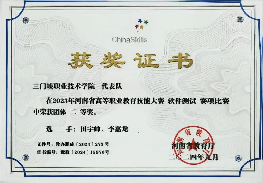 1.田宇帅、李嘉龙代表队在2023年度河南省高等职业教育技能大赛中获河南省教育厅颁发的团体二等奖;