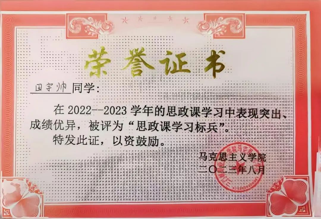 3.在2022—2023学年马克思主义学院组织的思政课学习中,表现突出,成绩优异,荣获“思政课学习标兵”荣誉称号;