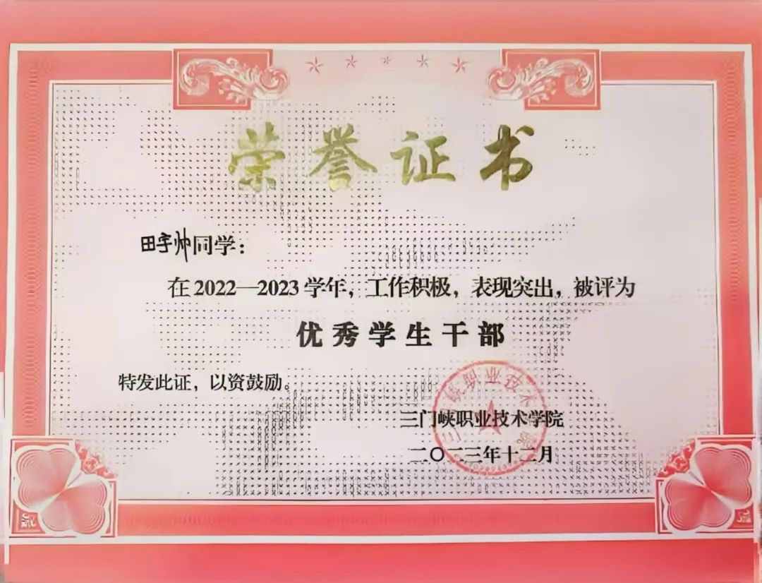 2.2023年12月被评为2022到2023学年三门峡职业技术学院“优秀学生干部”;