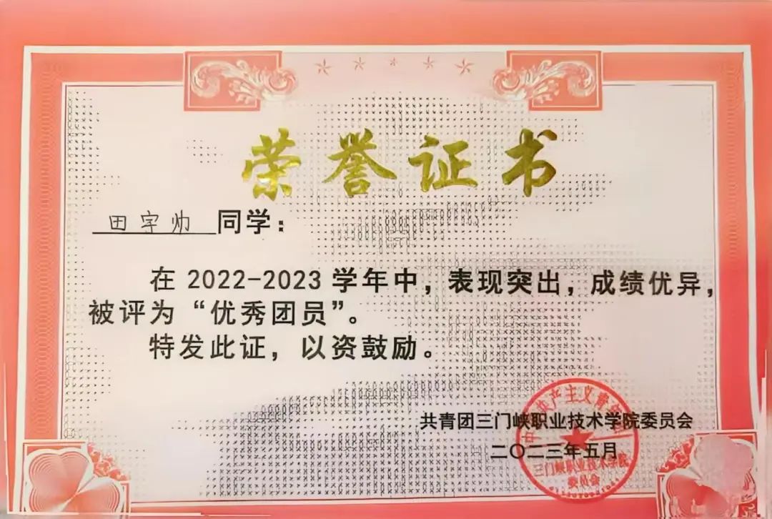 4.在2022—2023学年中,表现突出,成绩优异,荣获共青团三门峡职业技术学院委员会授予的“优秀团员”荣誉称号。