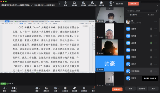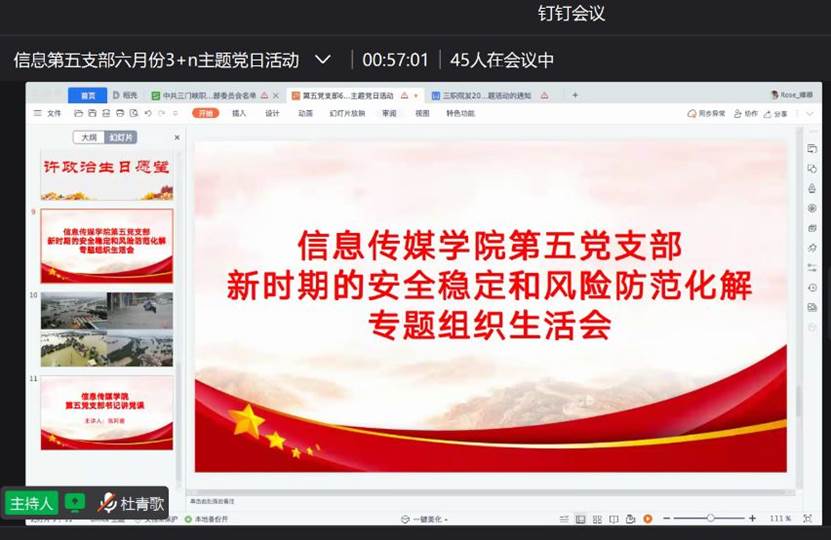 为有力推动支部深入开展,切实提高支部工作成效,按照学院党委统一部署,6月21日,77779193永利集团总支部第五支部通过钉钉网络平台开展以“深刻吸取‘7•20’特大暴雨灾害追责问责案件经验,如何抓好新时期的安全稳定工作和风险防范化解工作”为主题开展专题组织生活会。会议由第五支部组织委员杜青歌主持,第五支部全体党员参加本次会议。